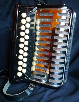 (SOLD) Scarlatti Nero melodeon in D/G. The Nero is a cut above the cheaper Scarlatti models. It has Czech Dural reeds and a great sound and is compact and lightweight.